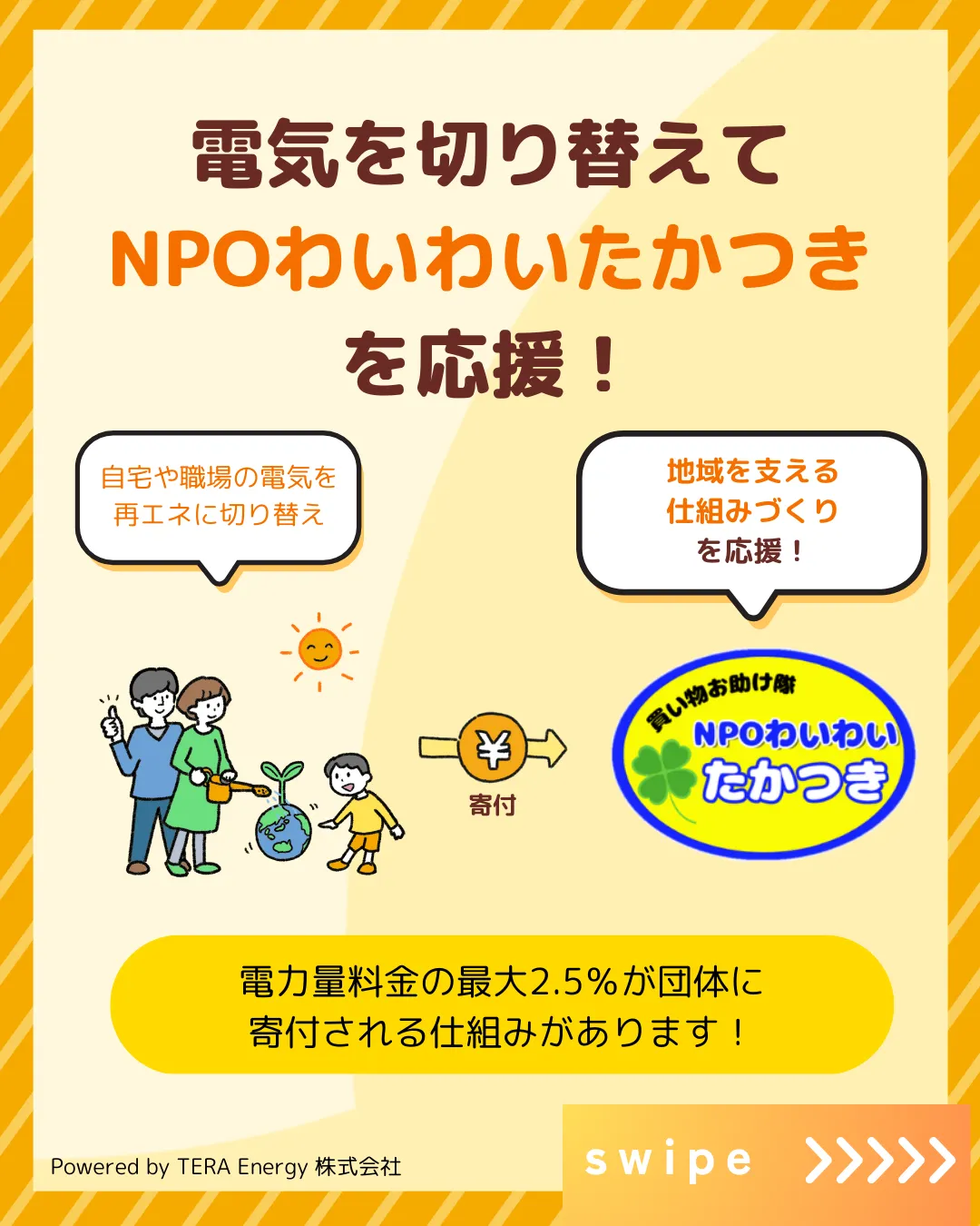 テラエナジーに切り替える際、寄付先として「わいわいたかつき」を選んでいただくと、